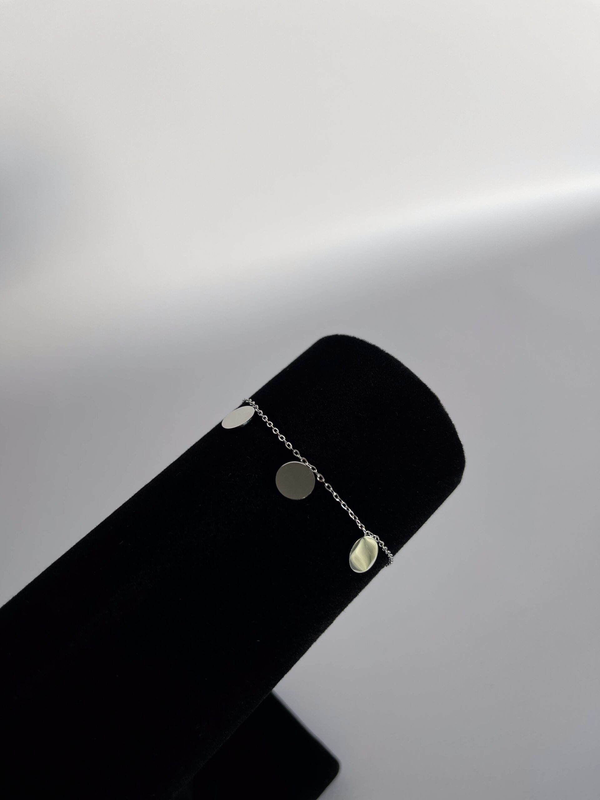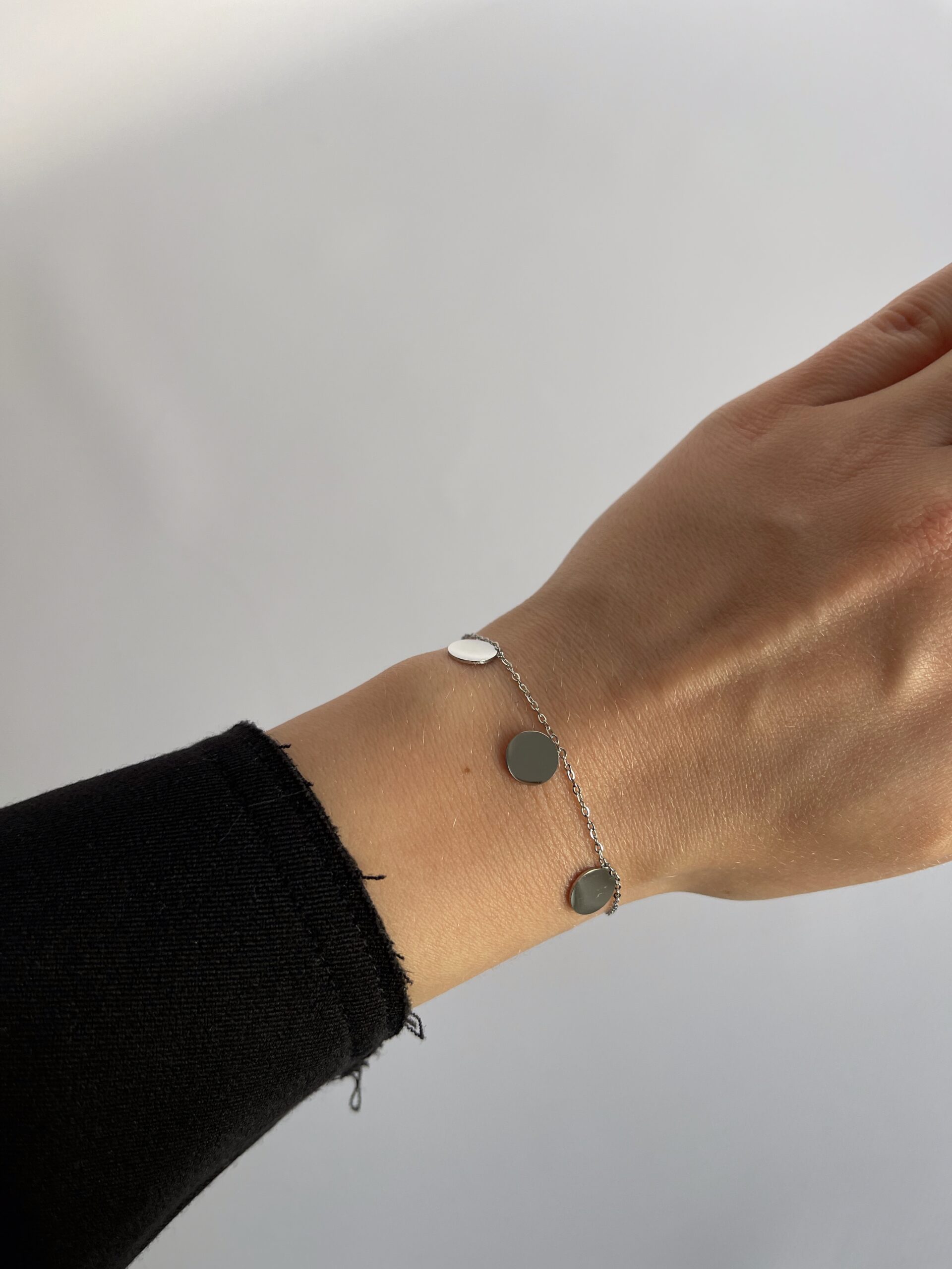 Mirror to delikatna, ale wyrazista bransoletka z trzema okrągłymi, połyskującymi pastylkami, które odbijają światło jak lustro.