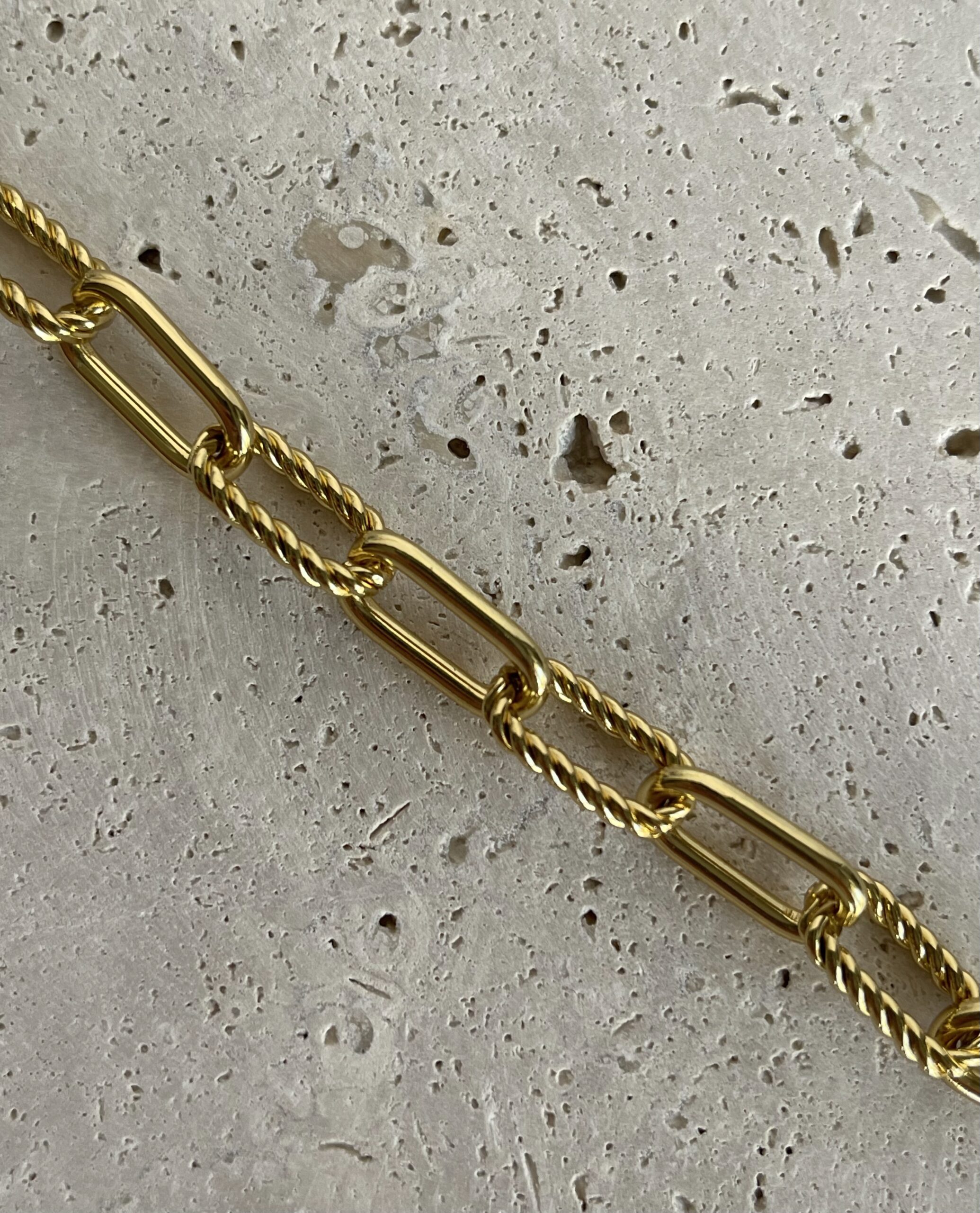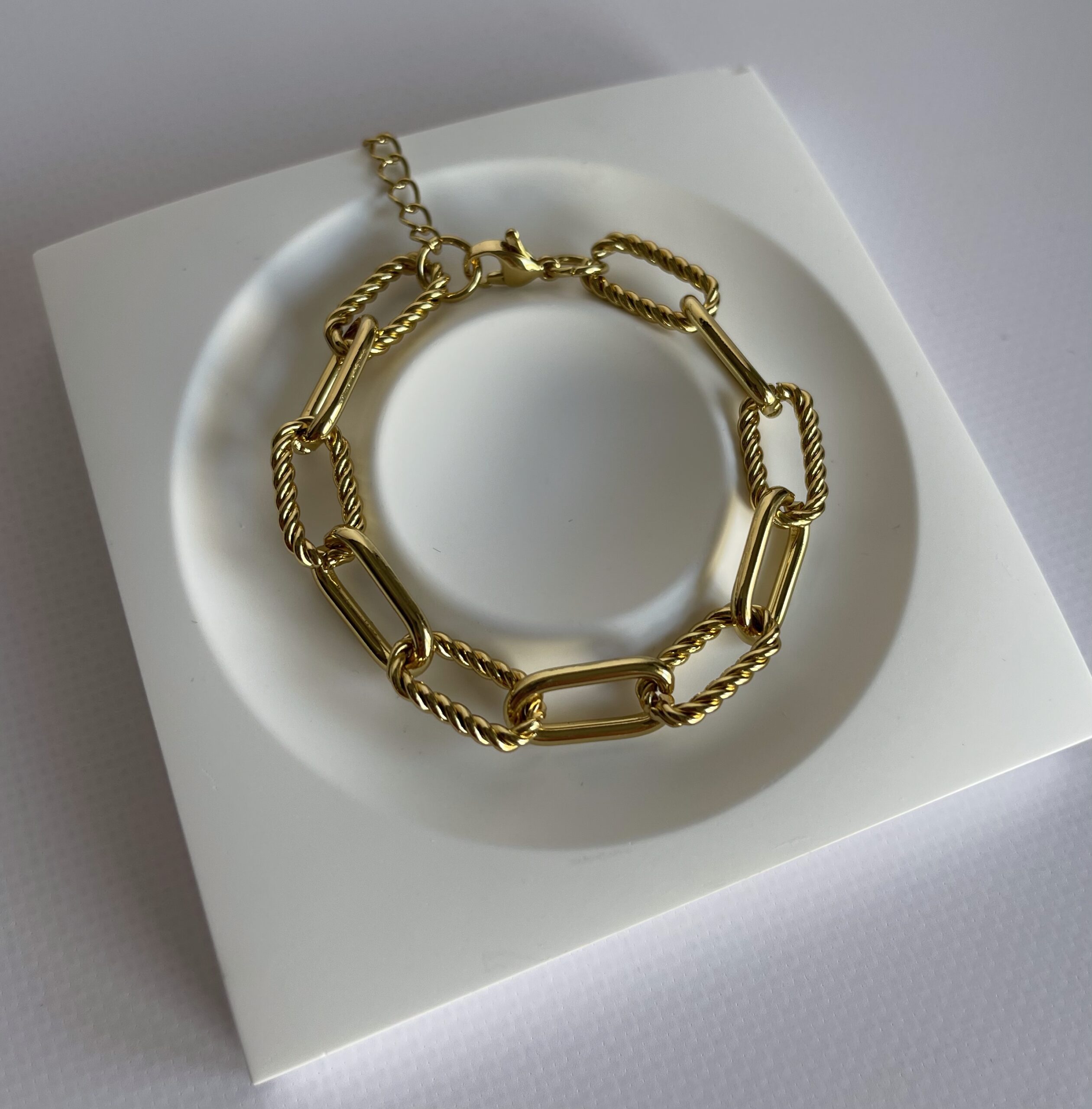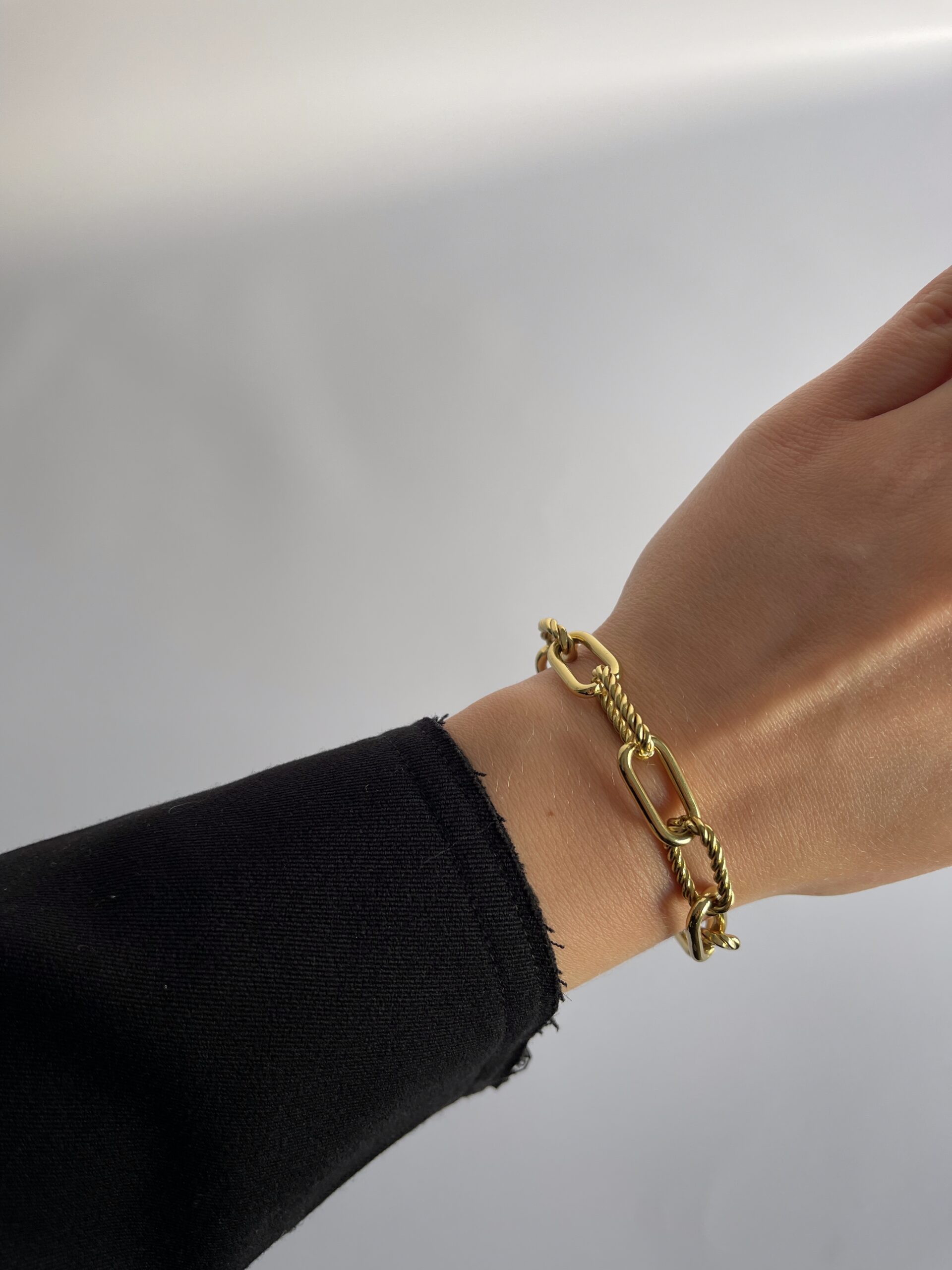 Silent Storm to bransoletka, która przyciąga spojrzenie kontrastem – gładkie i skręcone ogniwa przeplatają się rytmicznie, jak cicha burza pod powierzchnią.