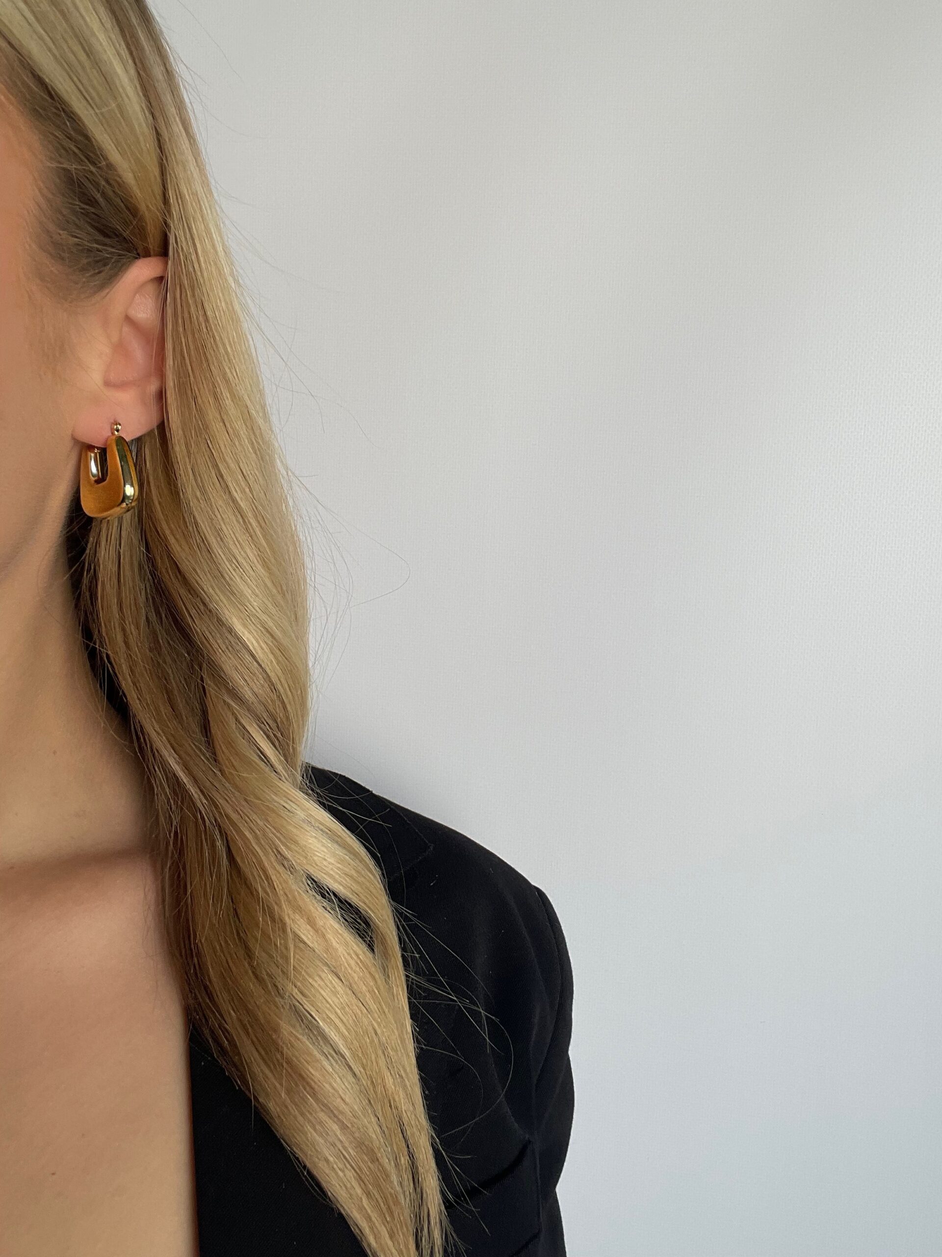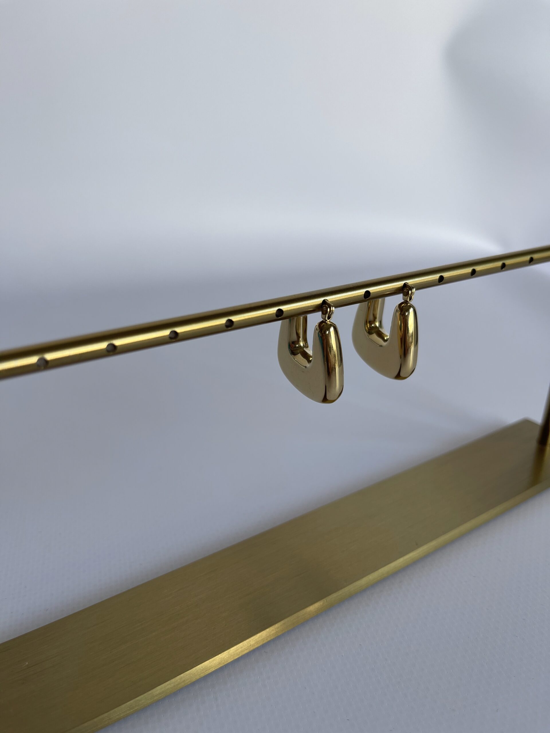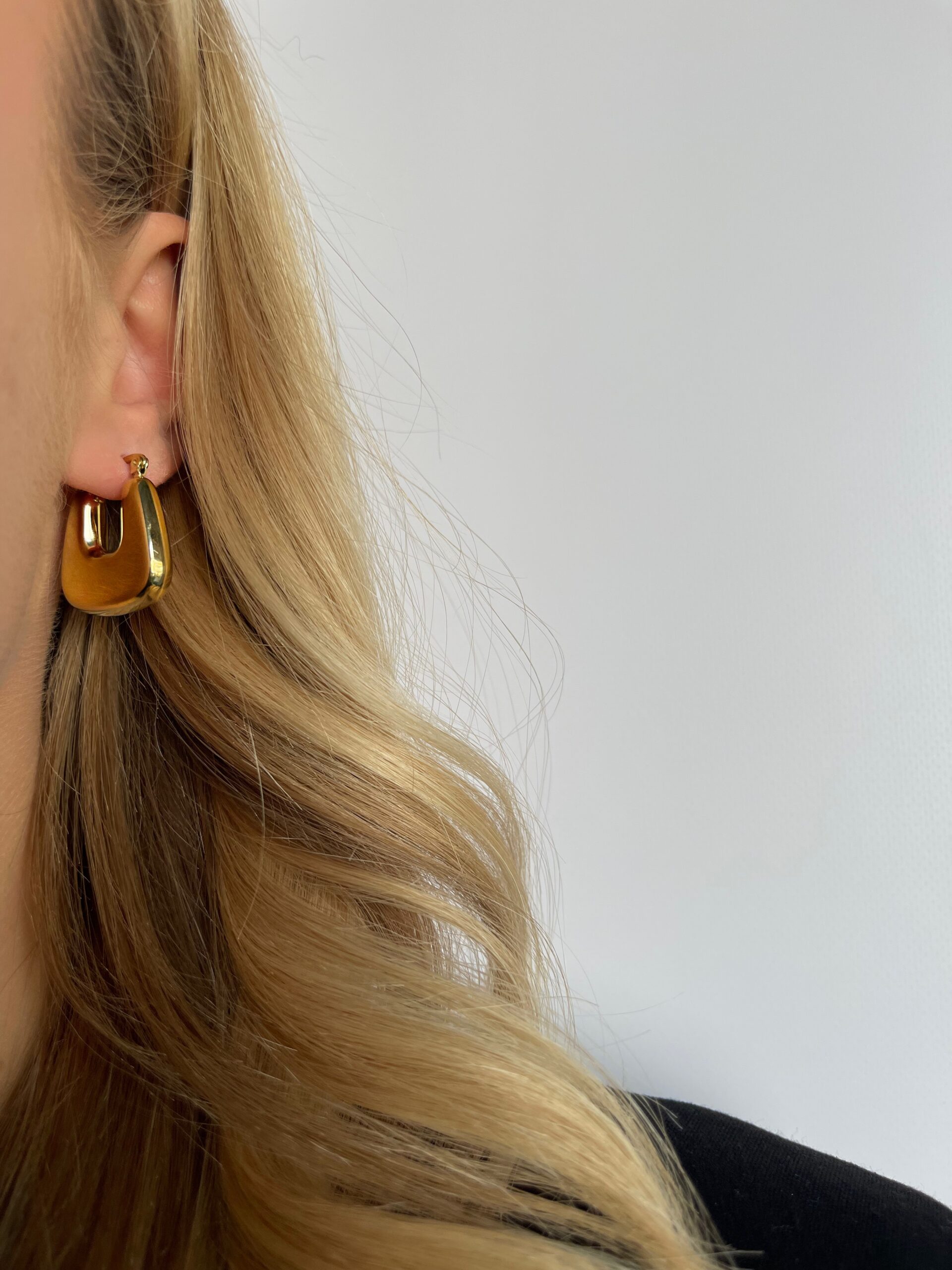 HAZE to złote, wiszące kolczyki o wyrazistym, lekko trapezowym kształcie z subtelnym otworem w centrum. Ich forma jest intrygująca, nowoczesna i pełna lekkości.