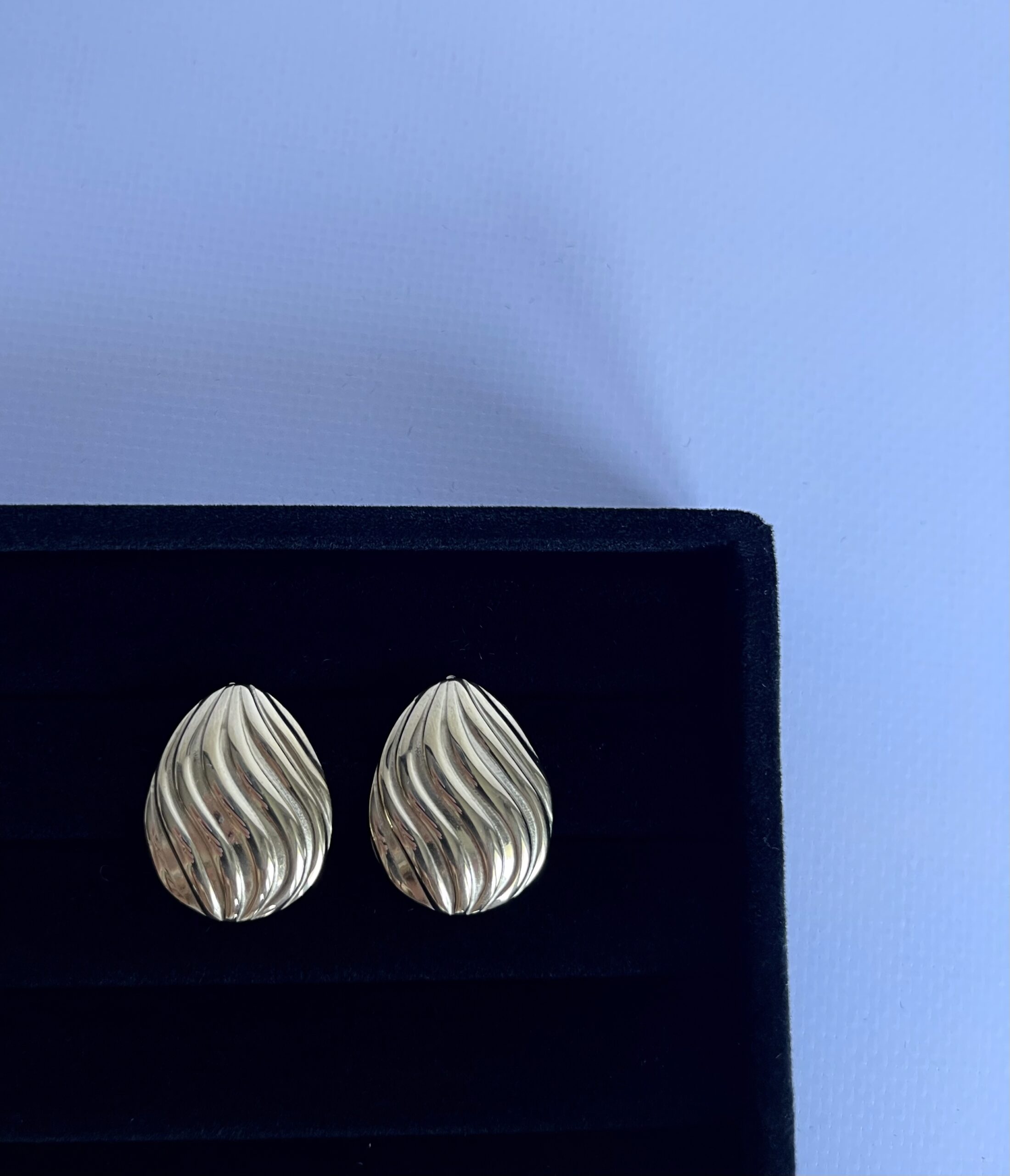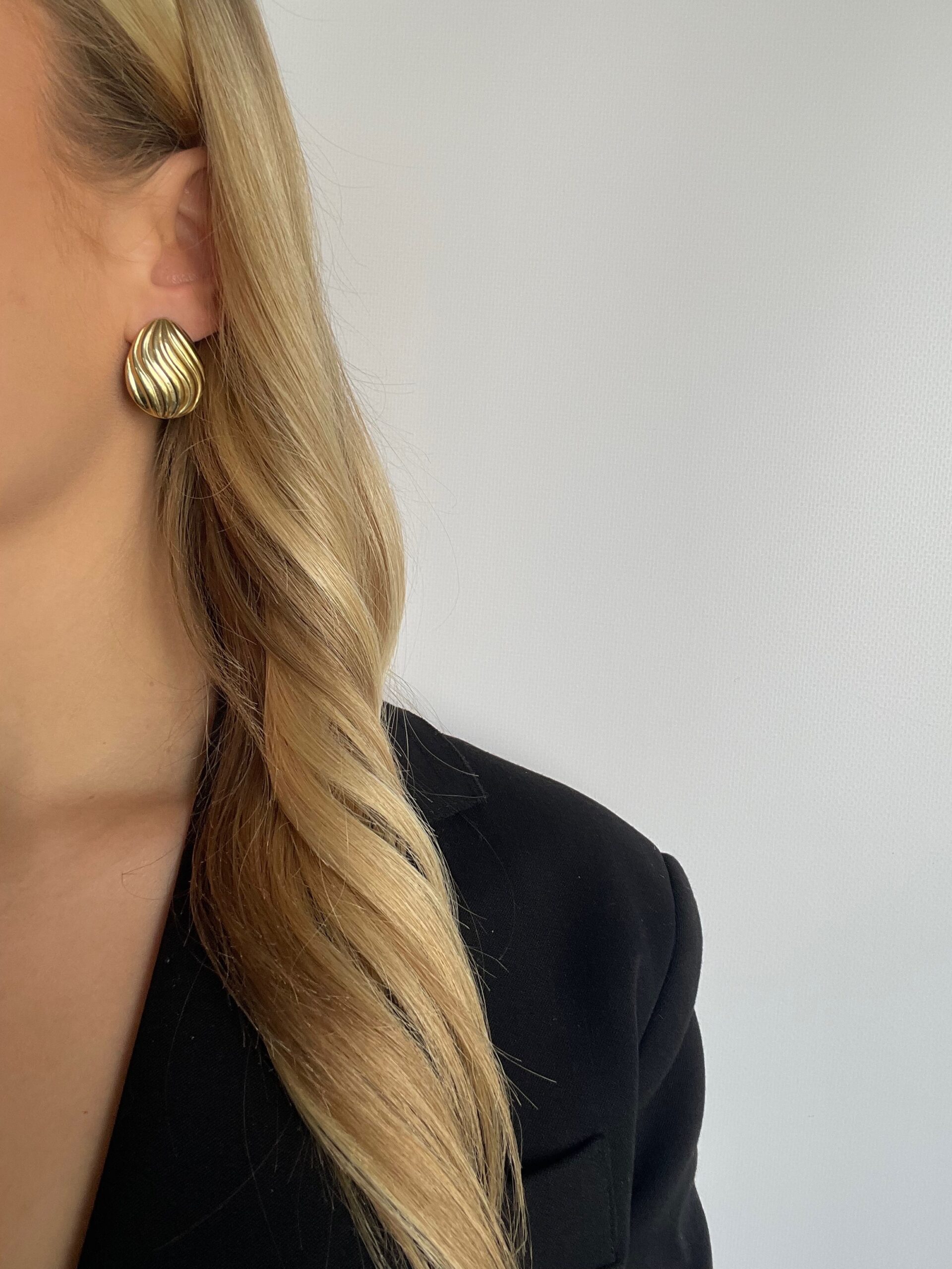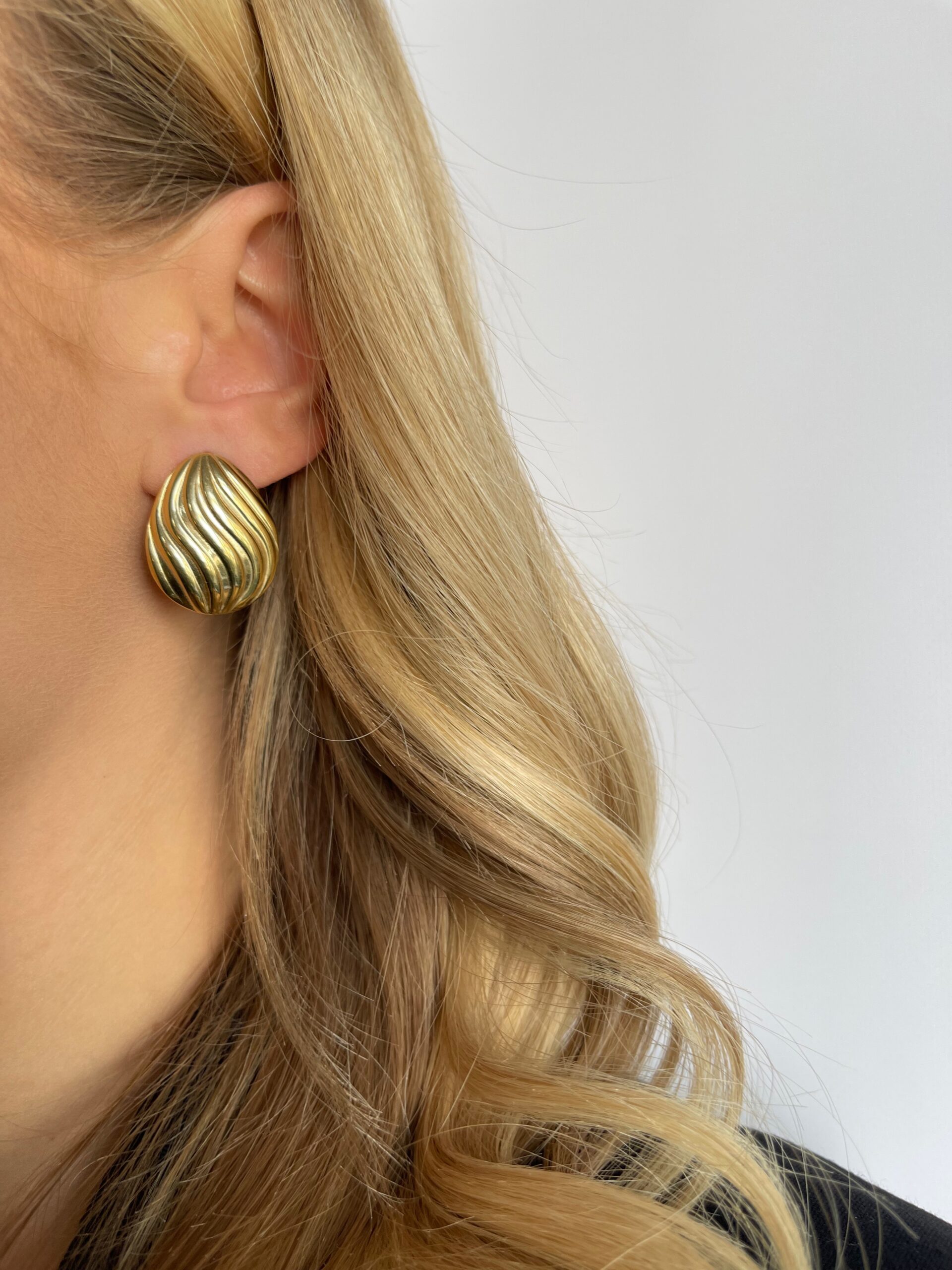 Te kolczyki w kształcie łzy przyciągają wzrok subtelnym falowaniem – jakby zrobione z płynnego metalu. Rzeźbiarskie i kobiece.