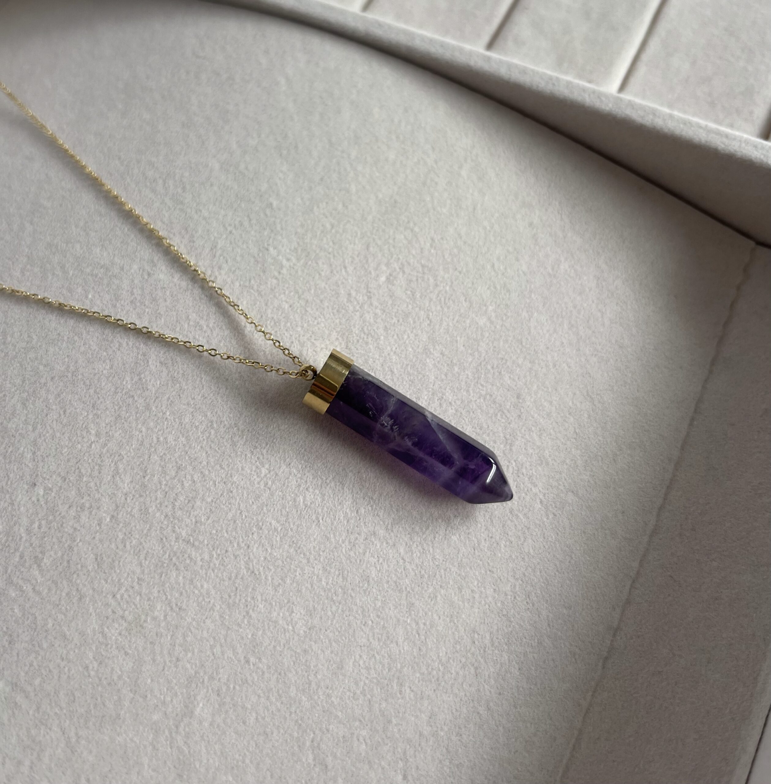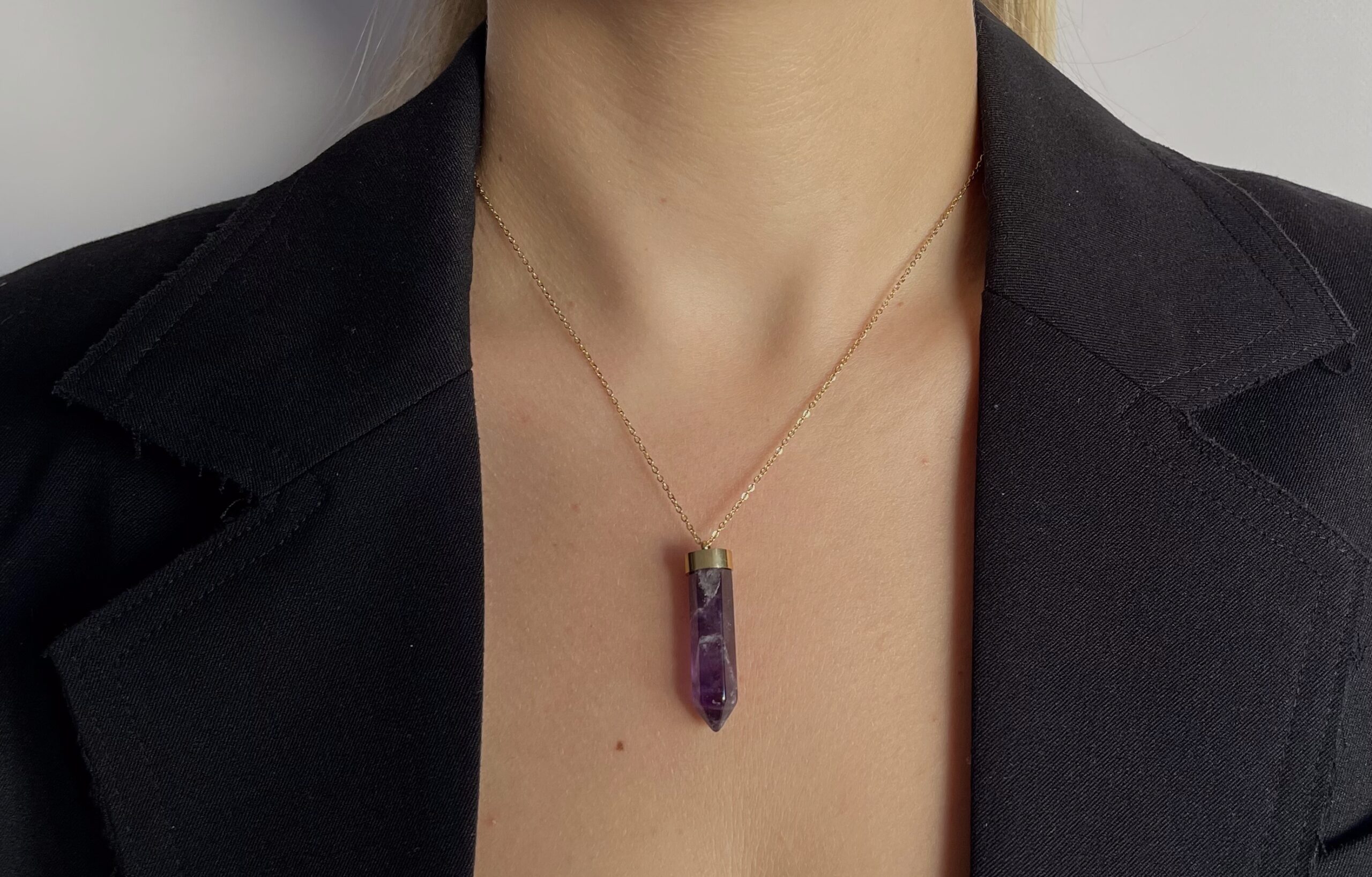 „Soul” to delikatny naszyjnik z naturalnym ametystem, kamieniem znanym z jego właściwości uspokajających oraz wspierających równowagę emocjonalną.