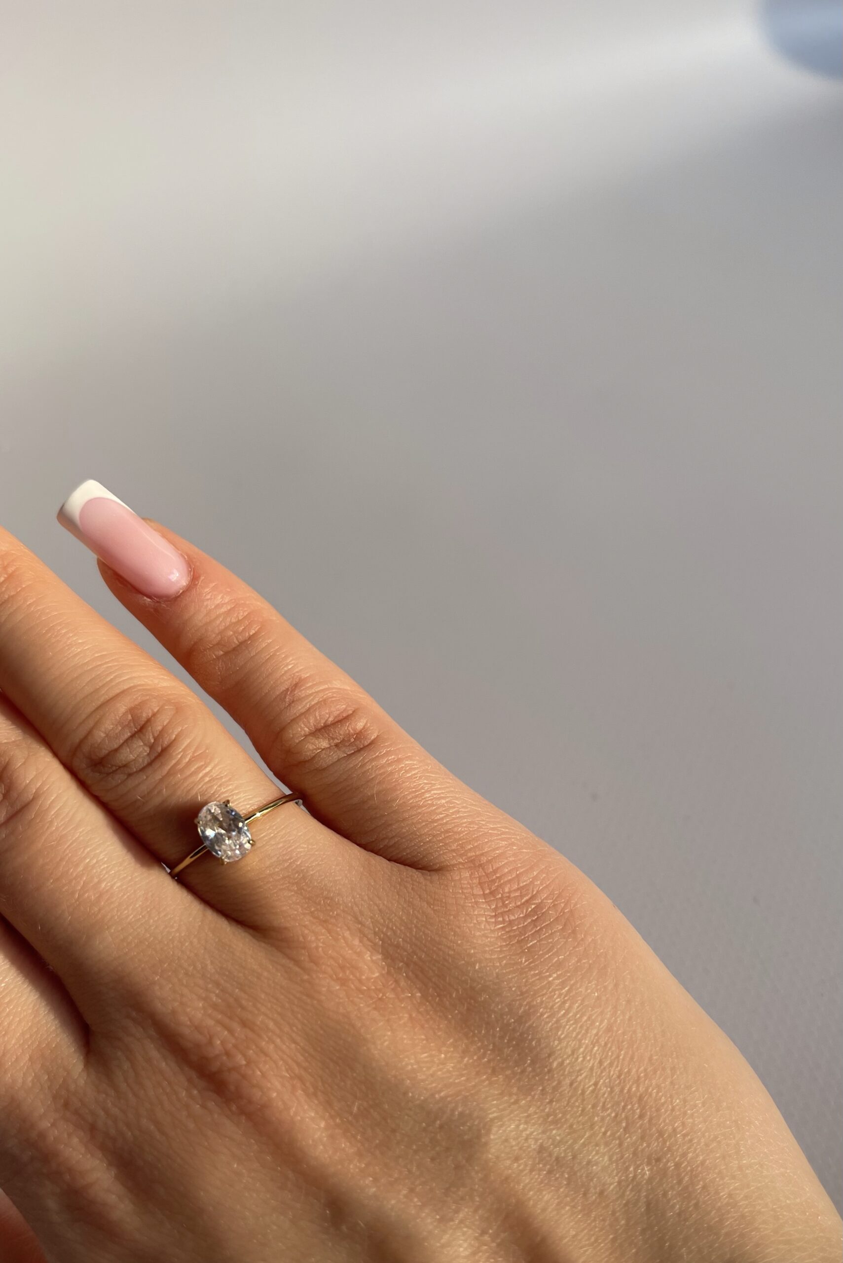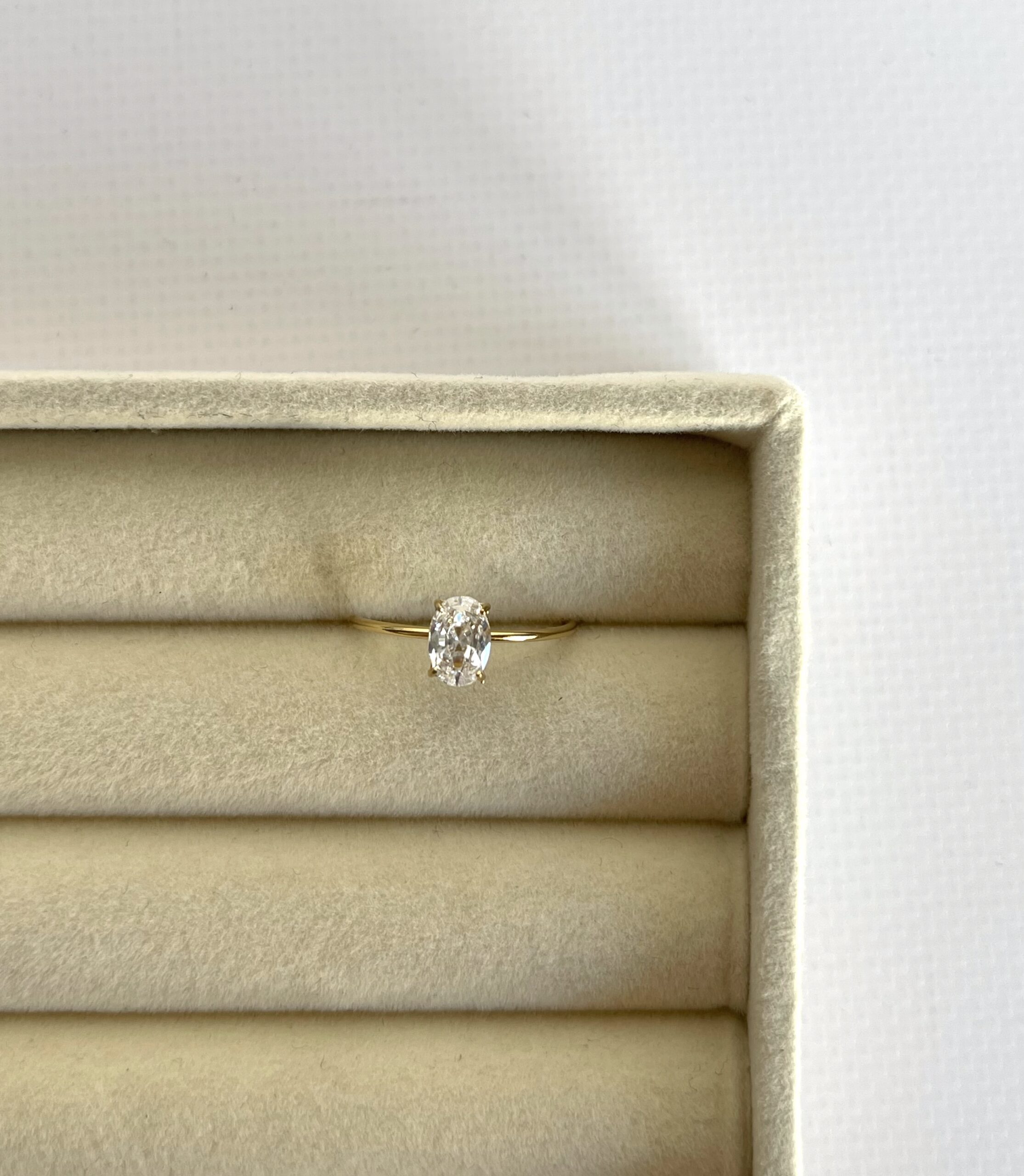 „Celia” to pierścionek z owalnym kamieniem, który przyciąga spojrzenia swoją prostotą i elegancją. Idealnie wyważony – między delikatnością a wyrazistością.